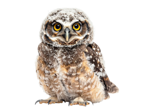 Adorable owl wearing a scarf joyfully plays in the snow, spreading winter cheer