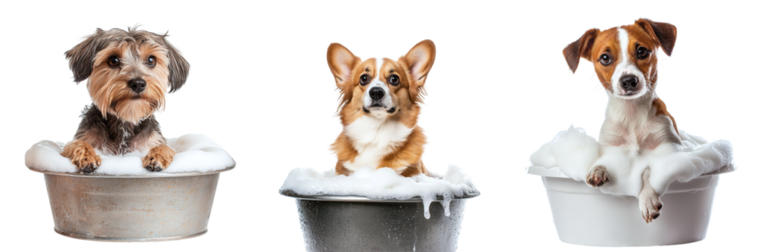Set of cute bathing dogs sitting in basin with foam isolated on transparent background PNG