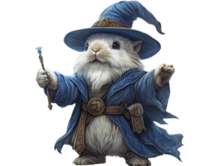 A cute wizard guinea pig in a blue hat casting a spell, white isolate background.