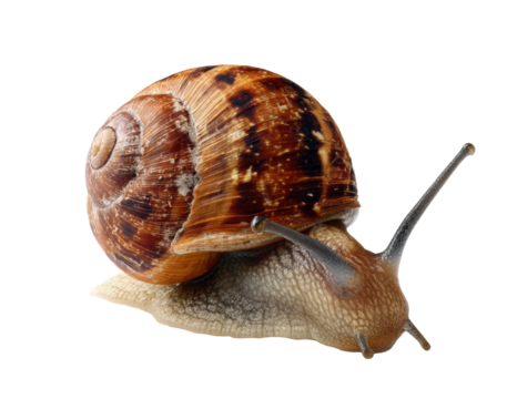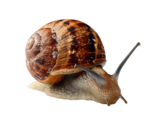 Close-up of a Garden Snail with Detailed Shell and Slime Trail, cut out transparent