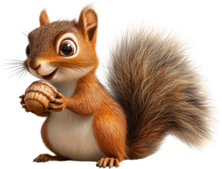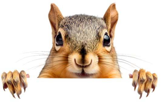Cute squirrel holding blank white banner in its paws isolated on transparent background