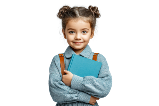 Young girl holding blue book with happy expression