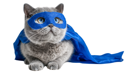 Cute cat wearing a superhero mask and blue cape on transparent background