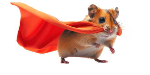 hamster wearing a tiny superhero cape, creating a cute and dynamic scene.