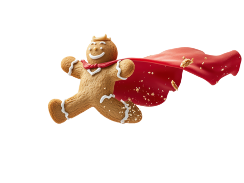 Isolated Gingerbread Superhero with Red Cape Flying Through the Air