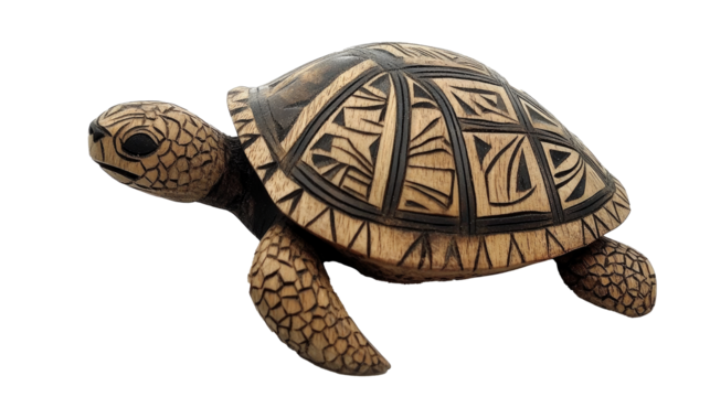 A wooden turtle with a patterned shell carved from a single piece on a white background png