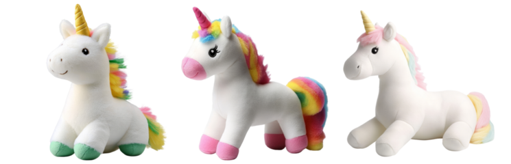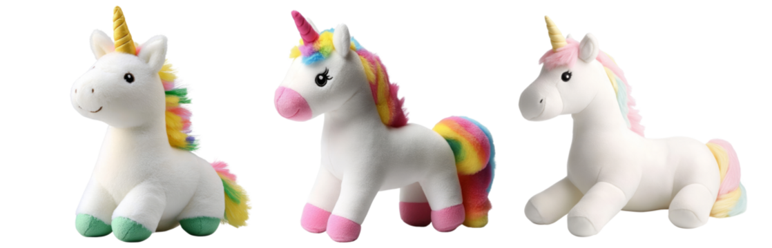 Three colorful plush unicorns on a transparent background.