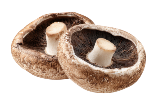 Two mushrooms are shown, one of which is cut in half, isolated on a transparent background