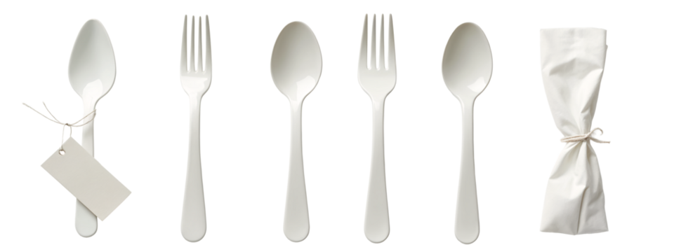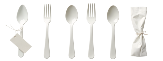 Disposable plastic cutlery: spoon, knife, fork isolated on a transparent background. Completely in focus. Full depth of field. Top view. PNG.