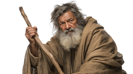 Elderly Cretan shepherd with staff on transparent background, biblical figure full-body PNG cutout symbolizing faith and wisdom for Christian design