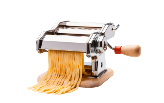 A pasta machine with a pasta cutter on top, ready to slice fresh pasta sheets