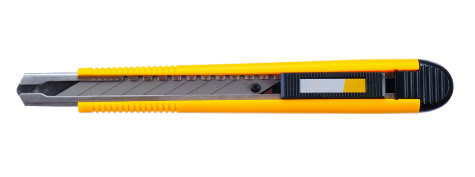 Utility knife cutter blade sharp cutting tool orange stationery equipment on transparent background