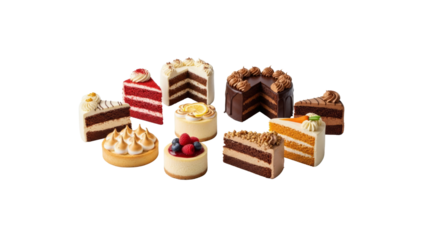 Collection of 4 set plate pile of little cake pastry dessert. French Financier almond, Madeleine Sponge, Canelé Canele, S'more smores on transparent cutout PNG file. Mockup template for artwork design