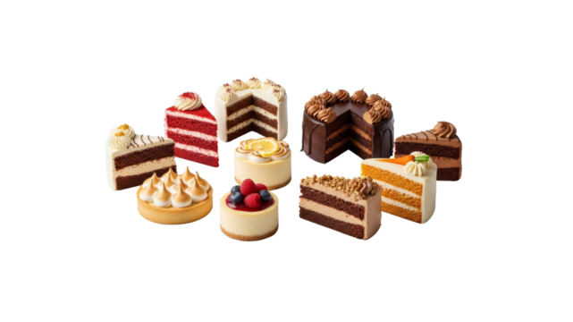 Red velvet cake slice with cream cheese frosting, layered sweet dessert, nuts topping, and a fork, transparent background