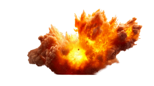 Powerful fiery explosion with smoke and debris scattering upwards, cut out transparent