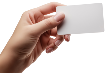 Hand holding blank white card isolated on transparent background