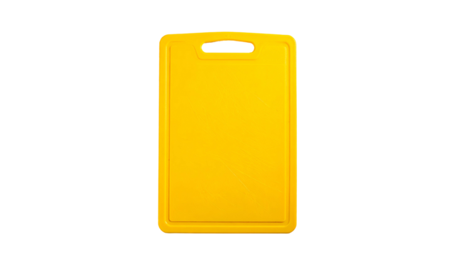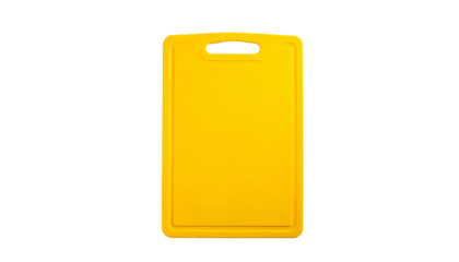 A rectangular, bright yellow cutting board with a handle hole, on a black background