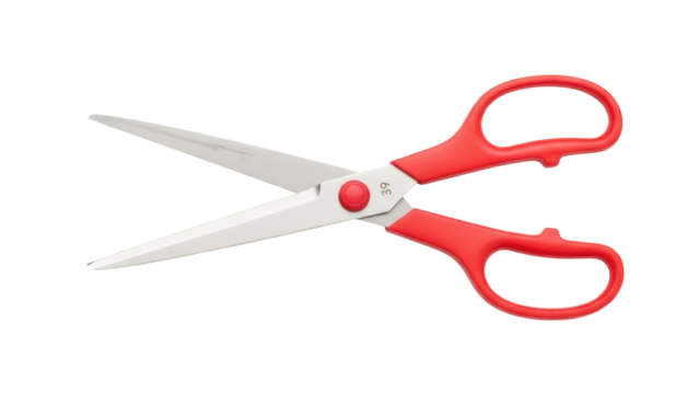 Sharp stainless steel scissors with red plastic handle, professional cutting tool for fabric, craft, or office use, isolated on transparent background, PNG.