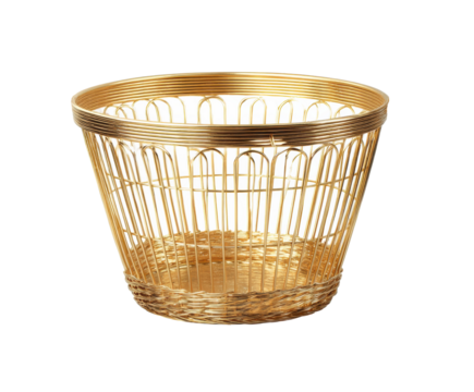 Elegant gold wire basket for home organization and decor on a transparent background, cut out