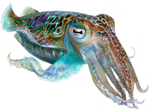 Striking studio shot of a live cuttlefish against a stark transparent background