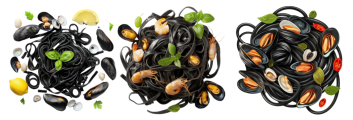 Black Squid Ink pasta Spaghetti with seafood isolated on white background set for restaurant menu