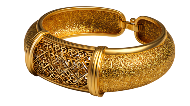 Elegant textured gold cuff bracelet with intricate geometric cutwork and polished trim isolated on transparent background