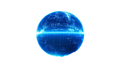 Digital sphere with neon blue accents, divided horizon on black