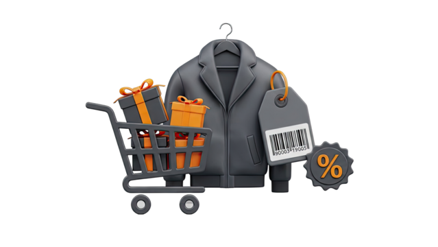 Shopping Cart with Gifts, Jacket, Barcode, and Discount Tag