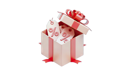 Open Light Pink Gift Box Tied With Red Ribbons Revealing Price Tags With Percentage Discount On Transparent Background Ideal For Sales And Promotions