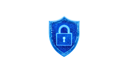 A stylized blue shield graphic with a padlock icon centered, set against a black backdrop