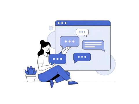 Woman sitting and interacting with a large chat window on a computer screen with speech bubbles isolated on transparent background