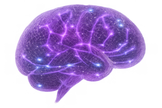 An illustration of a robot head with a human brain and various digital elements isolated on transparent background