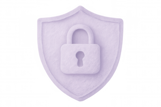 Purple shield safeguarding locked padlock, 3d rendering illustrating cybersecurity concept with transparent backdrop