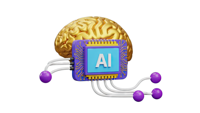 Artificial intelligence brain representing advanced computing, robotics, and cybernetic thinking, transparent background