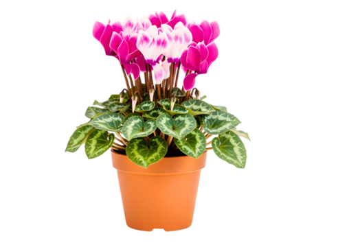 Isolated flowering cyclamen plant in pot, vibrant magenta color, beautiful floral houseplant