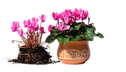Pink and white cyclamen flowering plant in terracotta pot isolated on transparent background