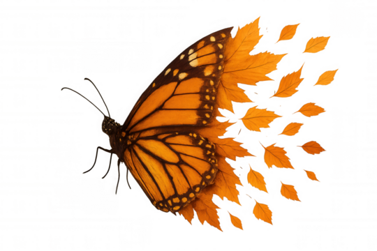 Butterfly with autumn leaves transforming, symbolizing change, season transition, growth, and natural life cycles