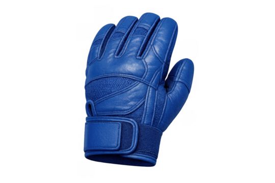 Blue leather work glove offering hand protection and safety for various demanding tasks with transparent background