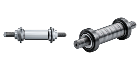 Bicycle hub axle and threaded hub spindle parts isolated transparency background with metallic texture and mechanical details