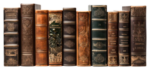 A vintage collection of colorful antique leather books forms a tall stack on a white background, representing a pile of classic literature and academic knowledge for school education and study