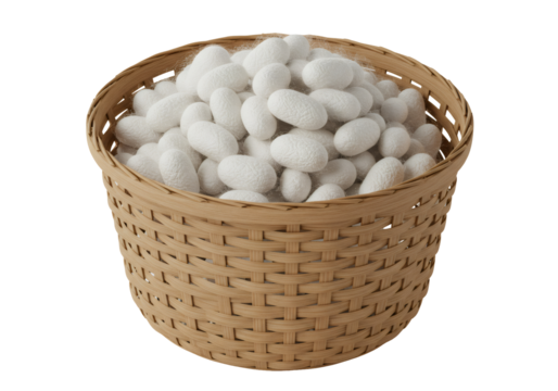 茶色のバスケットに白い繭が詰まったクローズアップ写真 バスケット織りの自然なテクスチャ