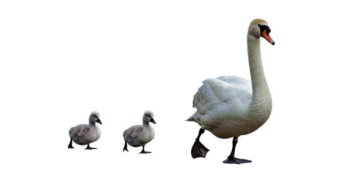 Tundra Swan & Cygnets: Family Walk, White Feathers, Isolated on White