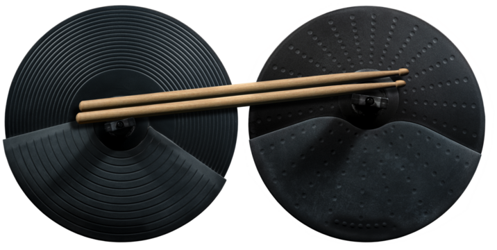 Two black cymbals of an electronic drum kit and a pair of wooden drumsticks, isolated on white or transparent background. Percussion instrument concept. Png.