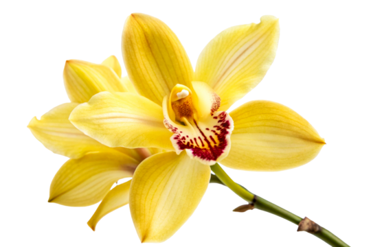 Vibrant yellow cymbidium orchid flower with dark red center and green stem ideal for tropical spa wellness marketing or elegant floral decorations for summer weddings