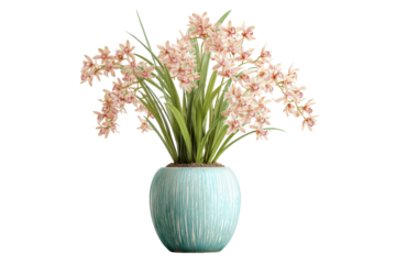 Elegant pink cymbidium orchid in ceramic pot on transparent background