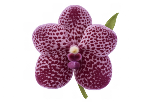 Purple spotted vanda orchid bloom with green leaf, isolated tropical flower on transparent background