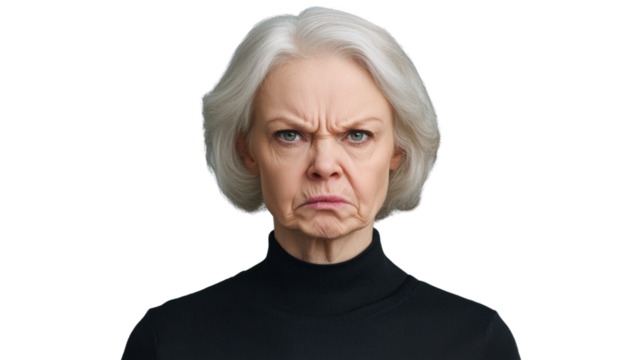 Senior woman expressing displeasure with frowning face on transparent background