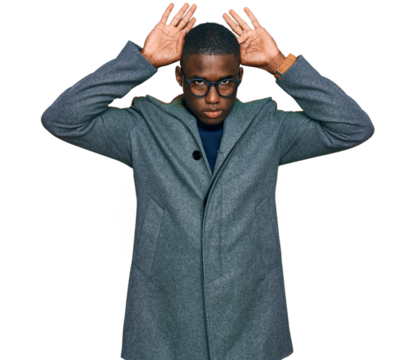 Young african american man wearing business clothes and glasses doing bunny ears gesture with hands palms looking cynical and skeptical. easter rabbit concept.