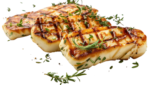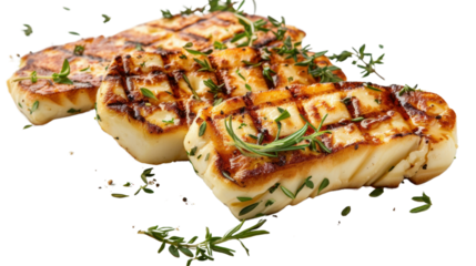 Grilled halloumi cheese with rosemary and thyme on transparent background