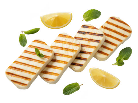Grilled Halloumi, lemon, and mint, isolated on transparent background.